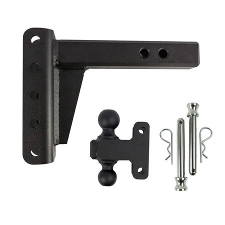 For 2 Inch Receiver; Lockable (Lock Sold Separate); 30000 Pound Gross Trailer Weight; Adjustable 4 Inch Drop/ 4 Inch Rise; Non Swivel; Non-Extendable; 9 Inch Shank; With Black Powder Coated Hitch Ball; Dual Ball - 2 Inch and 2 5/16 Inch; Steel; With Hitch Pin
