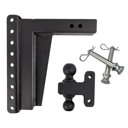 For 2-1/2 Inch Receiver; Lockable (Lock Sold Separate); 36000 Pound Gross Trailer Weight; Adjustable 12 Inch Drop/ 12 Inch Rise; Non Swivel; Non-Extendable; 9 Inch Shank; With Black Powder Coated Hitch Ball; Dual Ball - 2 Inch and 2 5/16 Inch; Steel; With Hitch Pin