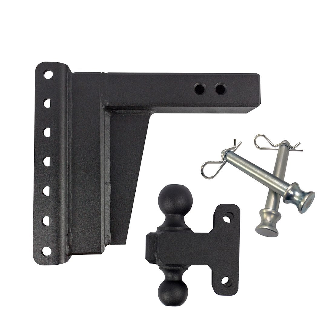 For 2-1/2 Inch Receiver; Lockable (Lock Sold Separate); 36 000 Pound Gross Trailer Weight; Adjustable 8 Inch Drop/ 8 Inch Rise; Non Swivel; Non-Extendable; 9 Inch Shank; With Black Powder Coated Hitch Ball; Dual Ball - 2 Inch and 2-5/16 Inch; Steel; With Hitch Pin