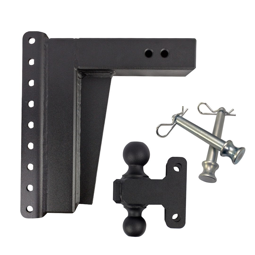 For 3 Inch Receiver; Lockable (Lock Sold Separate); 36000 Pound Gross Trailer Weight; Adjustable 12 Inch Drop/ 12 Inch Rise; Non Swivel; Non-Extendable; 9 Inch Shank; With Black Powder Coated Hitch Ball; Dual Ball - 2 Inch and 2 5/16 Inch; Steel; With Hitch Pin