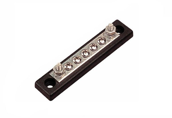 Flat Strip Type; 5 Stud Terminal/ 2 Screw Terminal; 100 Amp; 4-3/16 Inch Length x 7/8 Inch Width; Tin Plated Brass/ABS