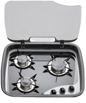 Cooktop; Black; 21-1/2 Inch Width x 4-1/8 Inch Height x 19 Inch Depth; Recessed Mount; Electric Ignition; 12 Volt DC; 6300/ 9800 BTU Maximum; 3 Burner