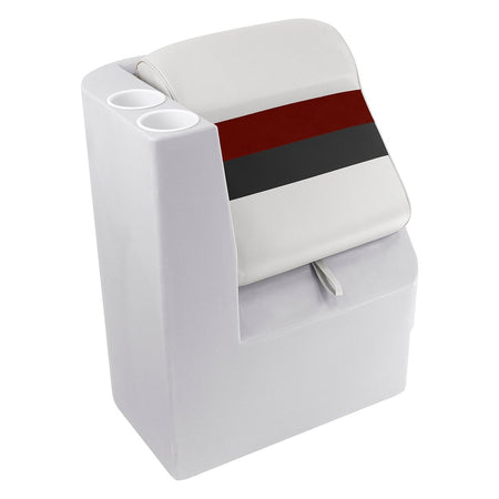 Passenger Seat; Left Radius Lean Back Recliner Type; Non-Adjustable; Non-Foldable; 29-1/4 Inch Height x 17 Inch Width x 23-3/4 Inch Depth Seat; 24 Inch Length x 15-1/2 Inch Depth x 11 Inch Height Molded Plastic Base; White/ Red And Charcoal; Marine Grade Vinyl Fabric; Without Headrest; With Built-In Cup Holder