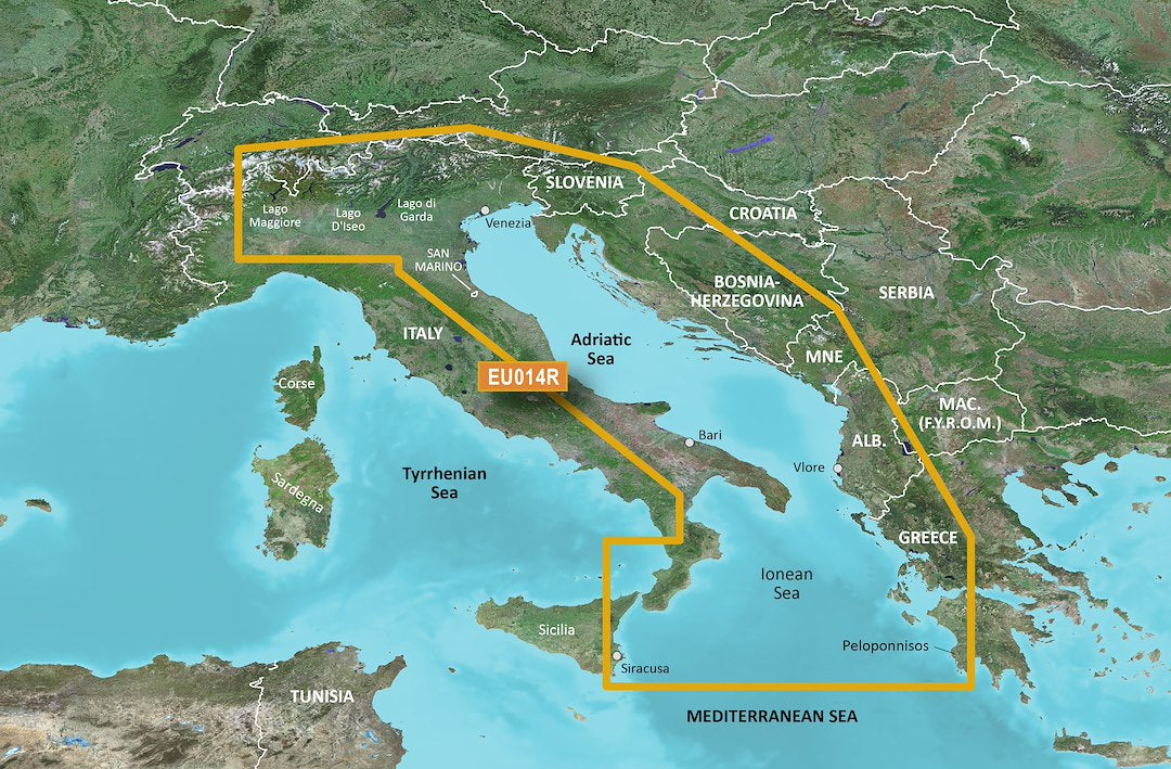 Compatible With Chart Plotters; Region Code: VEU014R; Detailed Coverage Of Italy And Adriatic Sea; On SD/Micro-SD Card; With Integrated Garmin/Navionics Content Auto-Guidance High-Resolution Shading 3D Views Shaded Relief Satellite And Aerial Imagery