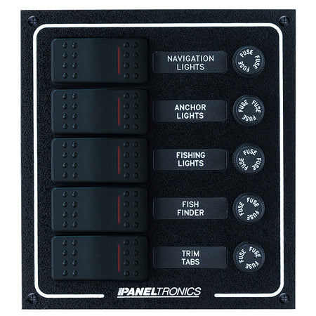 The Paneltronics 9960007B Waterproof DC 5 Position Lighted Rocker & Fuse is the perfect solution for exposed marine applications, providing durability and reliable performance. Featuring a built-in red indicator light, this switch ensures easy visibility in any lighting condition. The splash-proof fuseholders come equipped with 10 Amp fuses, offering essential overcurrent protection to keep your equipment safe. Upgrade your marine electrical system with this dependable rocker switch.