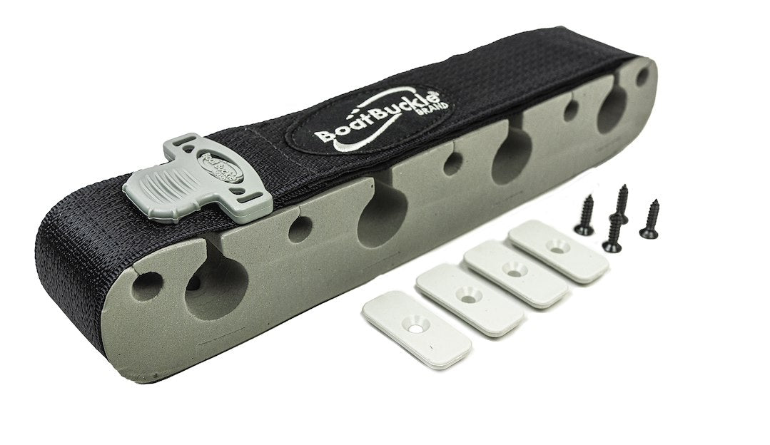 Surface Mount; Holds 8 Fishing Rods; Cradle and Strap Style Hold; Black/ White; Foam Molded Inserts and Polyester Straps; With Mounting Hardware/ 12 Inch Length Strap